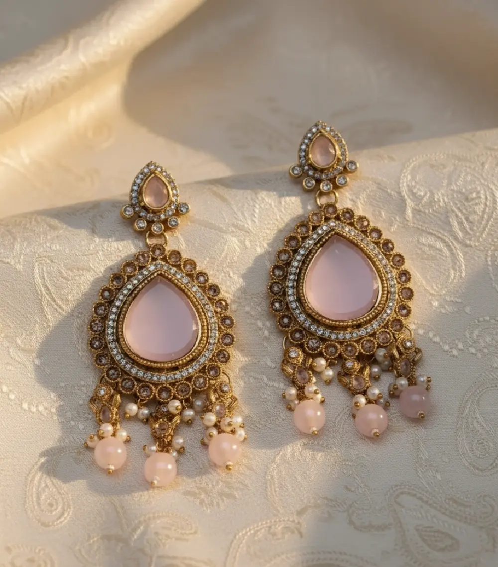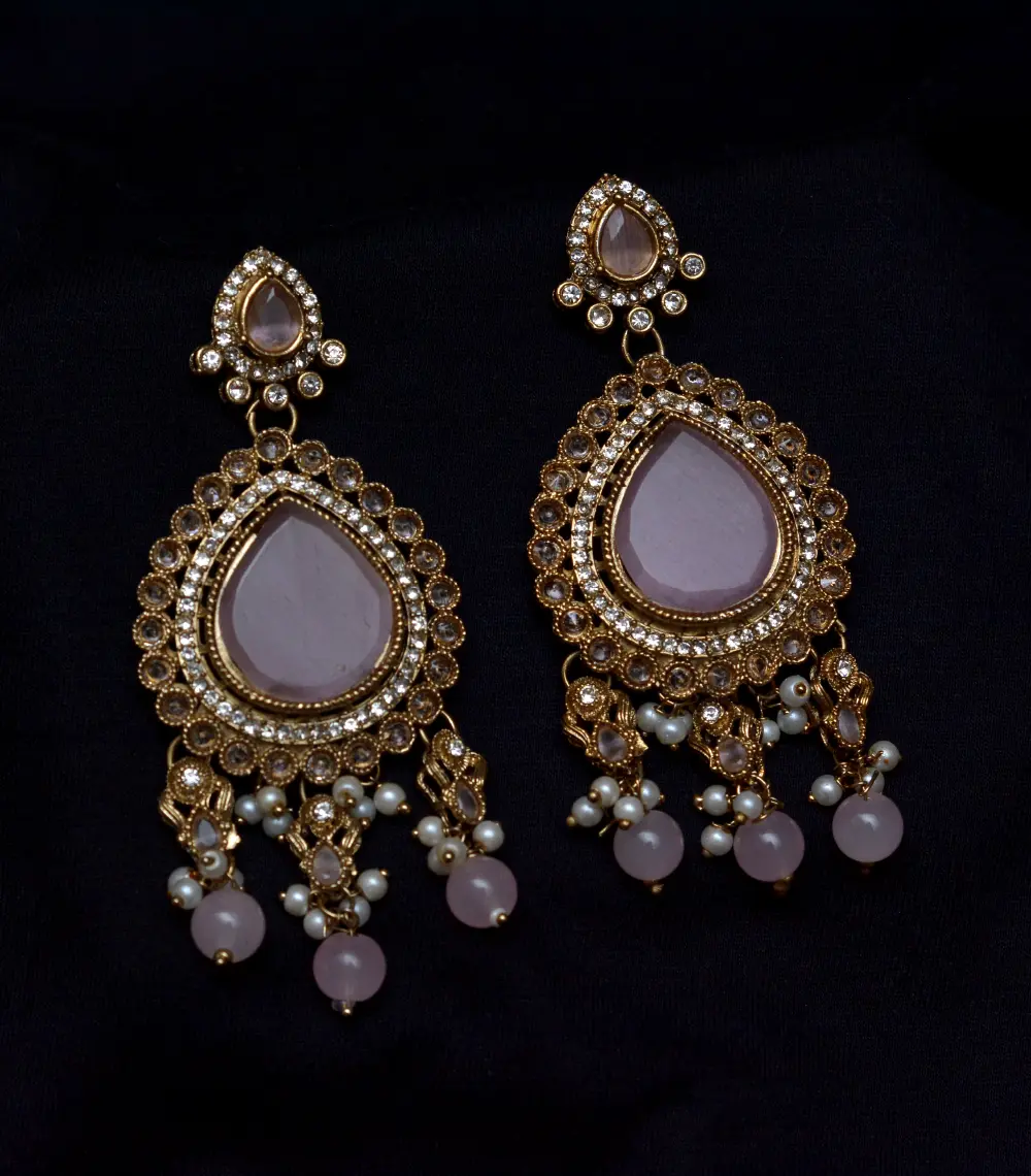 Teardrop earrings with antique gold, crystals, and pearl drops, blending traditional elegance and timeless charm perfect for weddings, festivals, and celebrations.