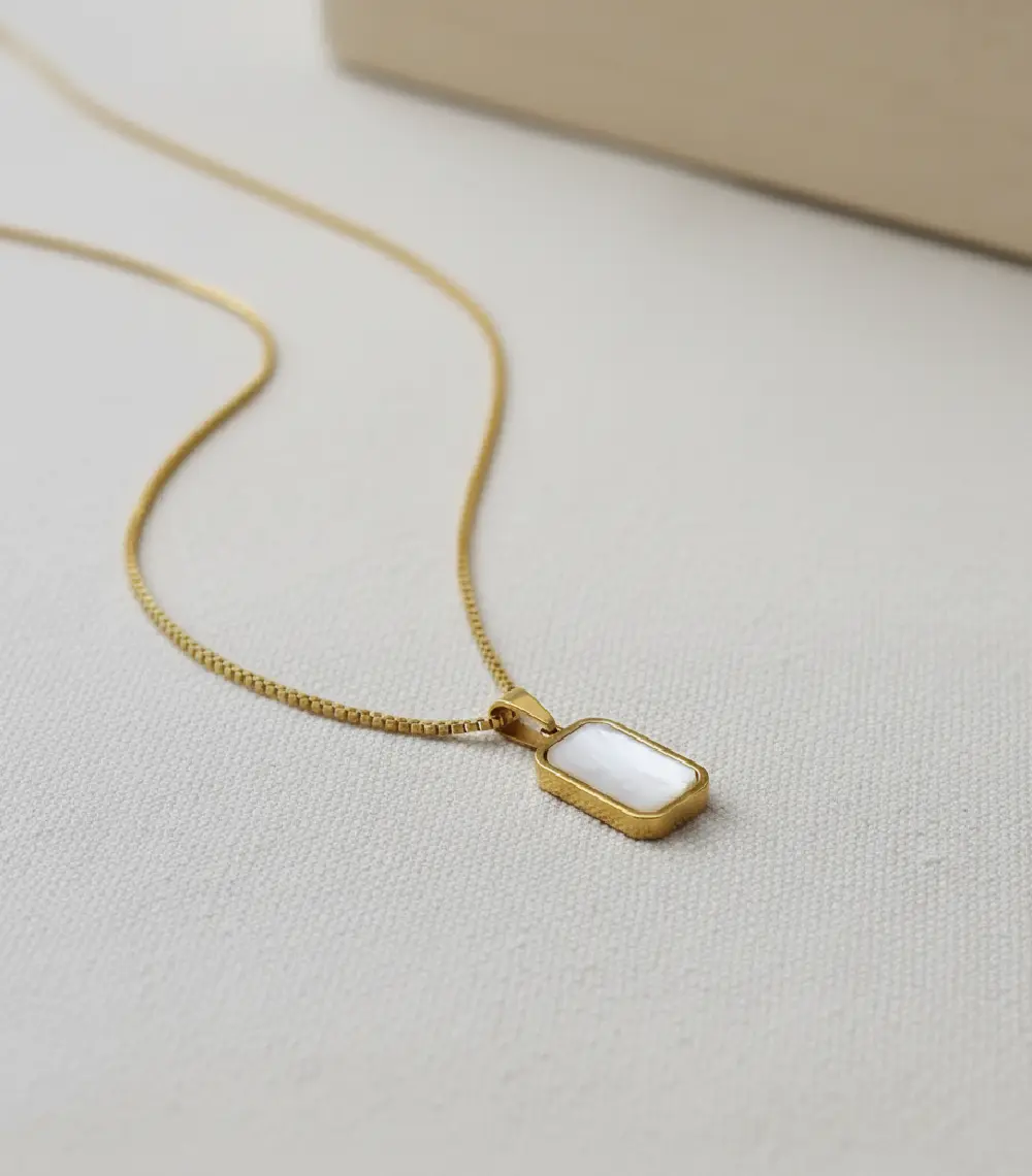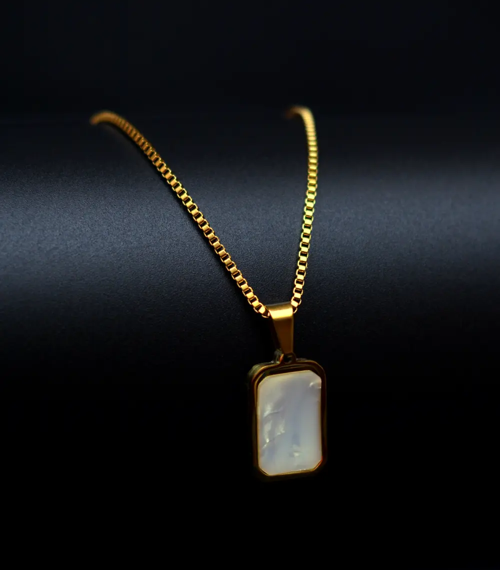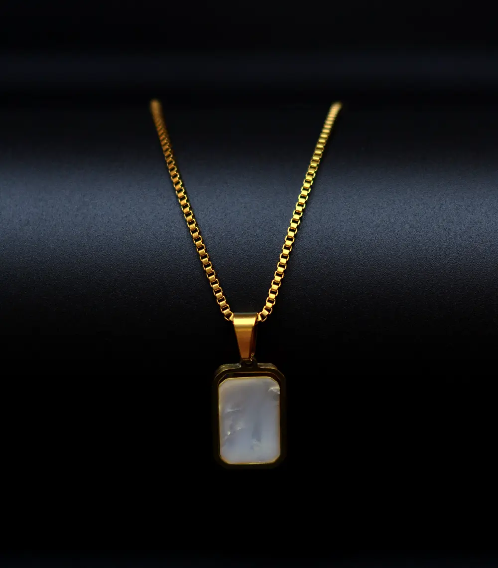 A versatile dual-sided pendant featuring a glossy mother-of-pearl finish set in a sleek metallic frame. Suspended from a bold box chain, it adds effortless luxury to both modern and classic looks.