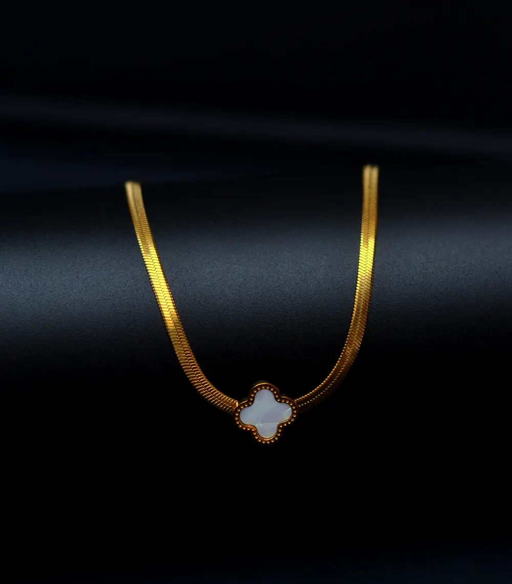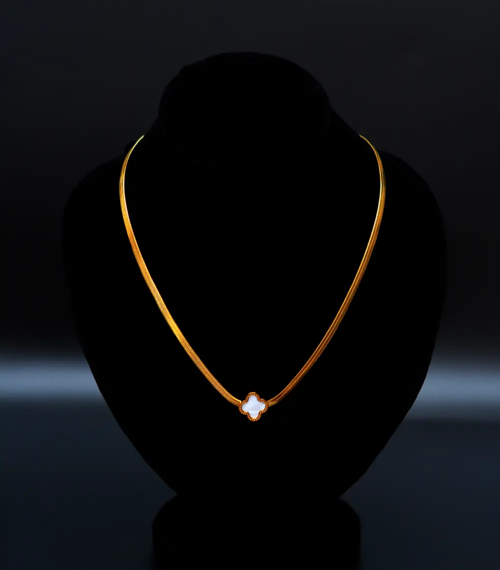 A refined and minimal pendant with a sleek metallic chain and a delicate white clover charm designed to add a touch of grace to any outfit.