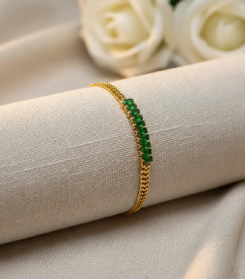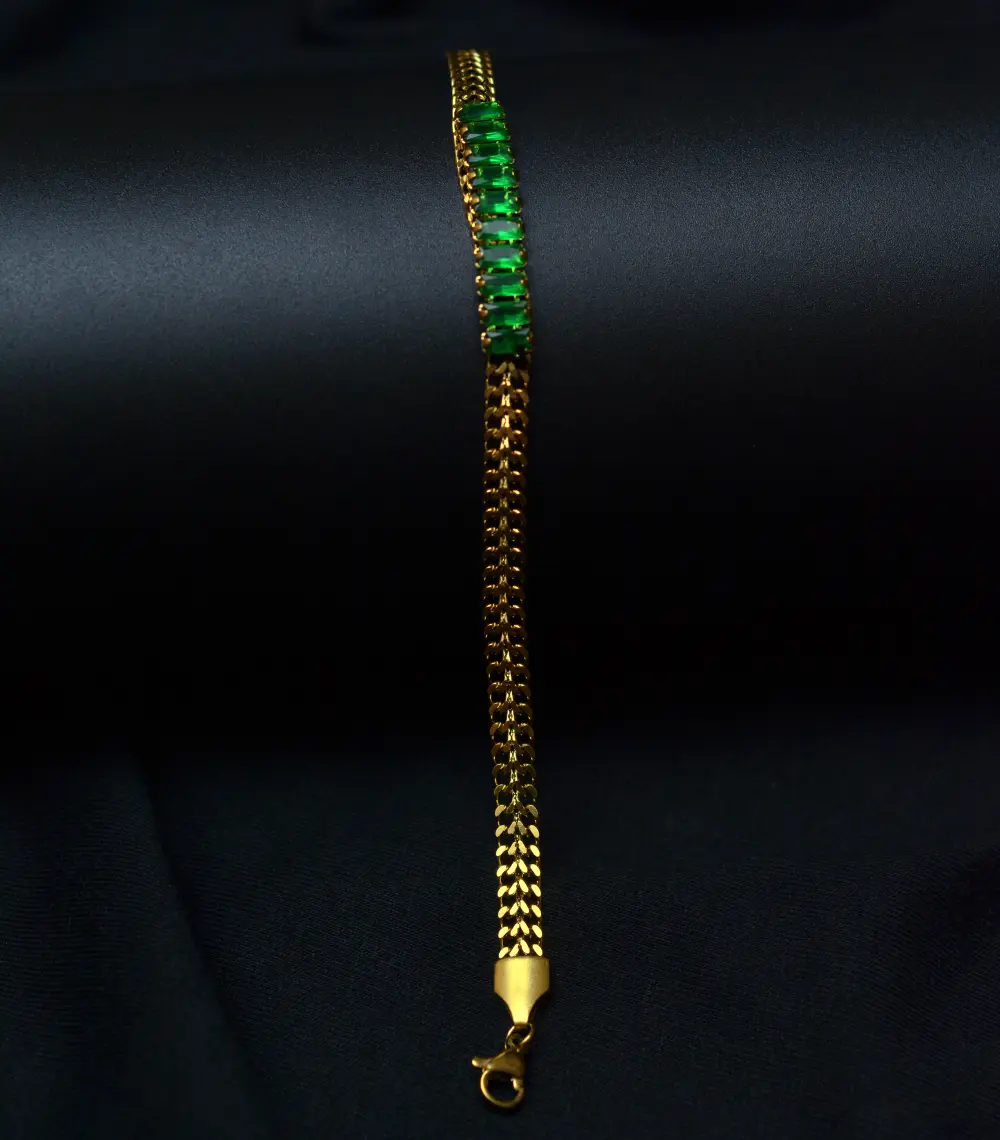 An elegant bracelet adorned with shining green diamond shape. Perfect for adding a touch of sparkle to your everyday style or special occasions.