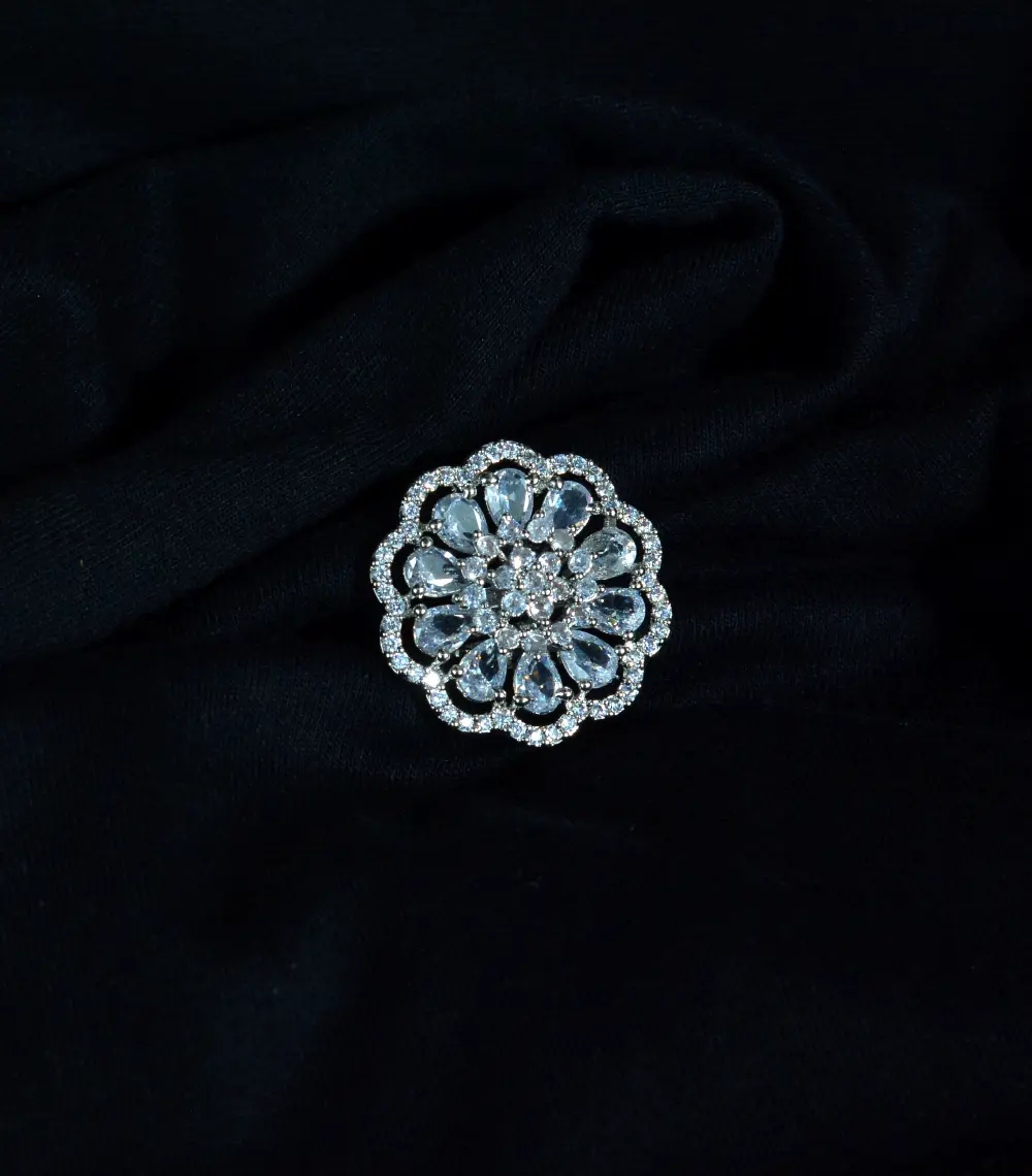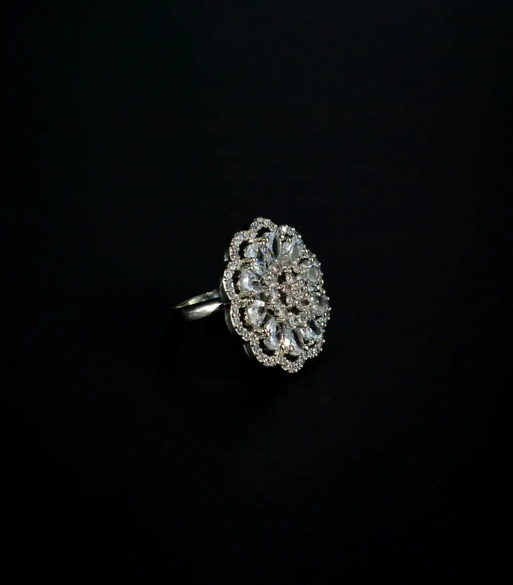 A delicate silver toned ring, inspired by the elegance of jasmine blooms. Perfect for formal wear and adjustable for a perfect fit.