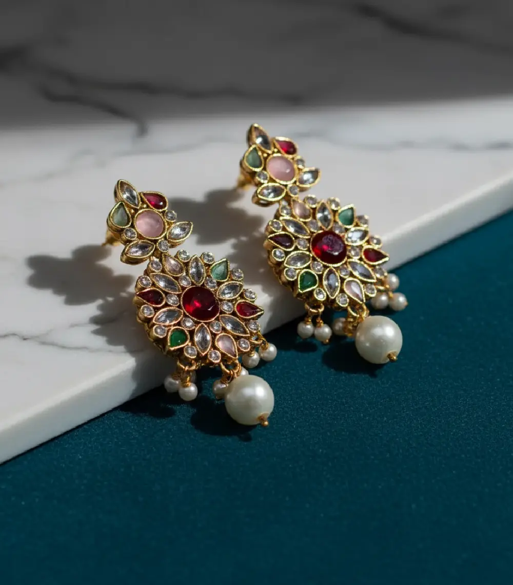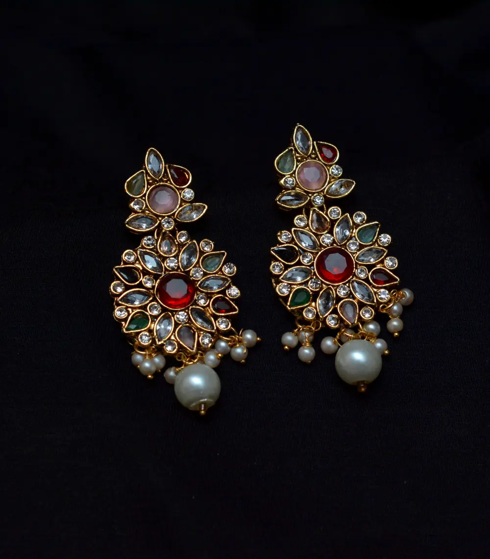 Floral drop earrings with maroon stone, clear crystals, and pearl drops perfect for adding timeless elegance and sophistication.