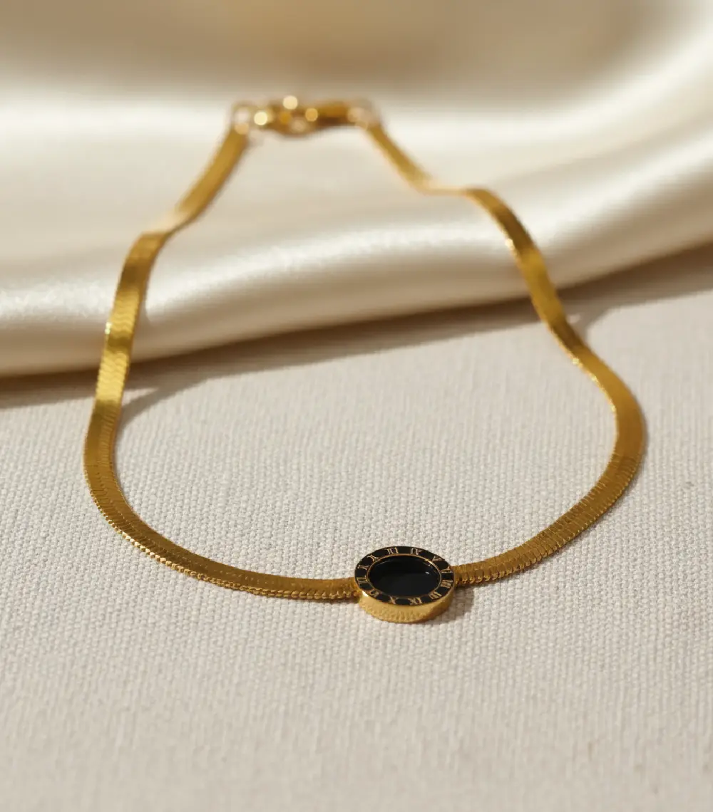 A modern pendant with a round golden design featuring elegant Roman numerals in the center. Paired with a flat, shiny chain perfect for adding a classy touch to any outfit.
