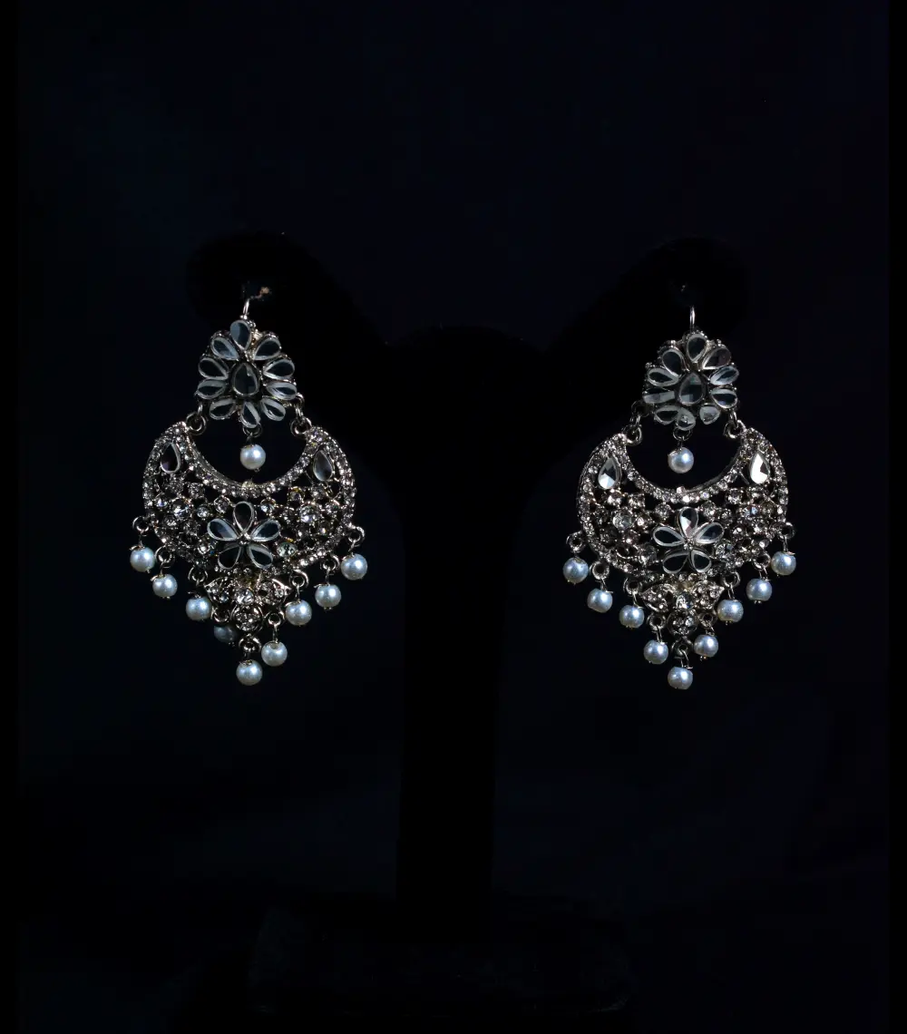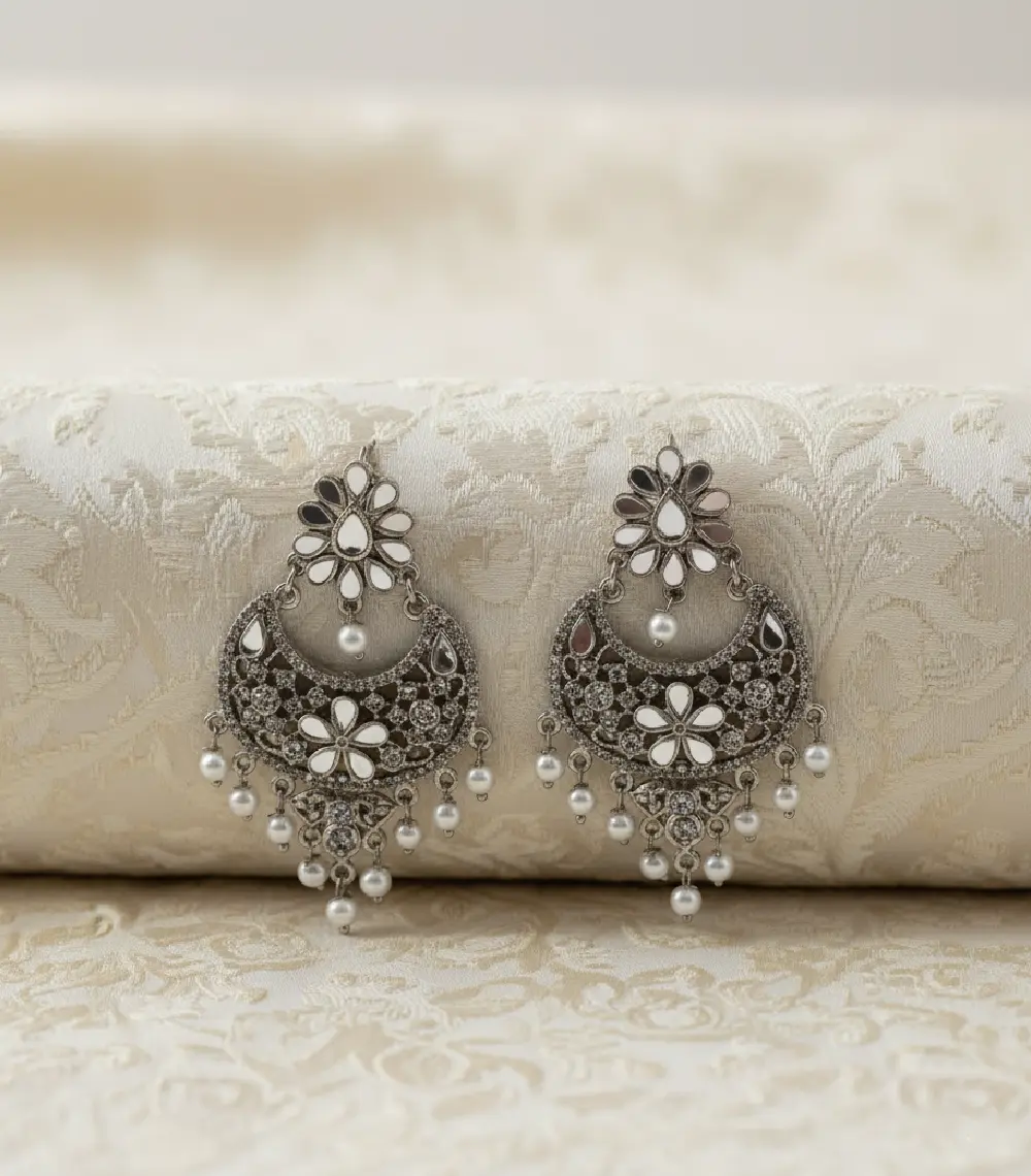 An elegant pair of silver chandbali earings with pearls at bottom, Perfect for weddings and festive occasions.